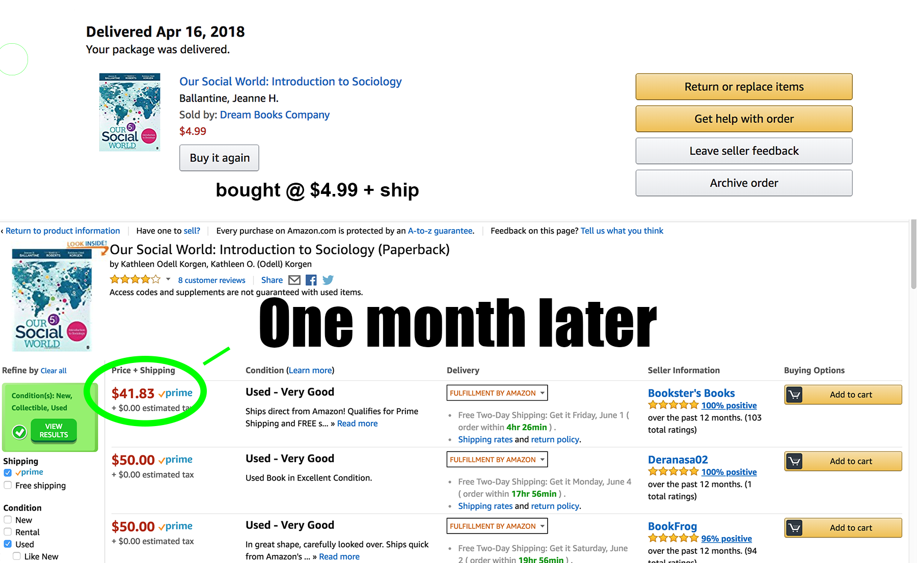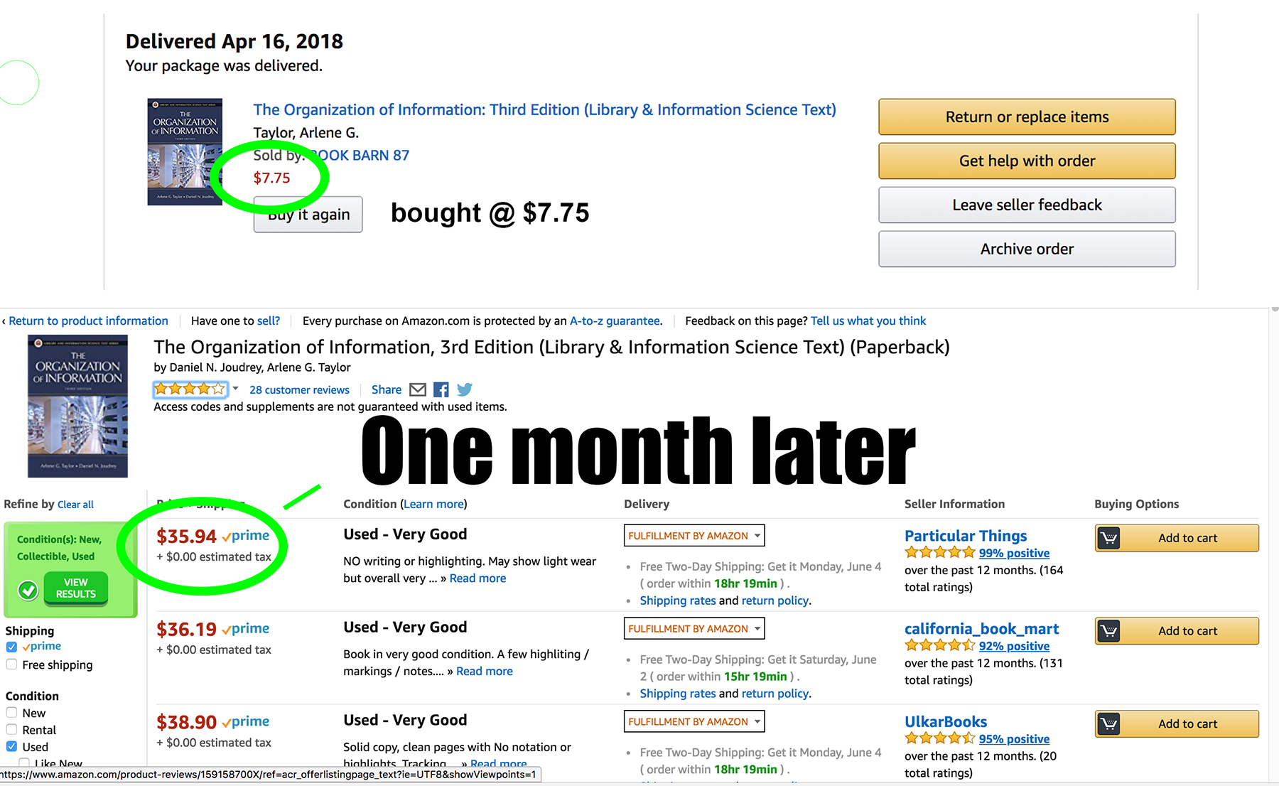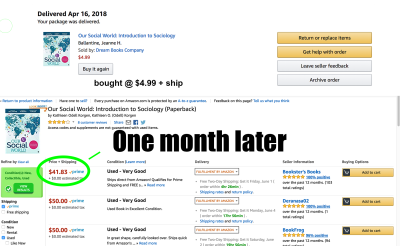 Instance 1: Purchased in April @ $7.75+ Ship, One Month Later @ $35.94. Not even in textbook season but; Predict as excessive as $55+ in August