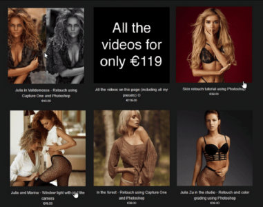That is my retouch video bundle. At the moment there are 38 of them accessible. In most of those movies I present put up-manufacturing from begin to en with detailed explanations of each step. There are additionally explanations concerning the mild within the particular photograph. In lots of them I additionally embody behind the scenes footage from the precise shoot so you possibly can see the sunshine and the situation.