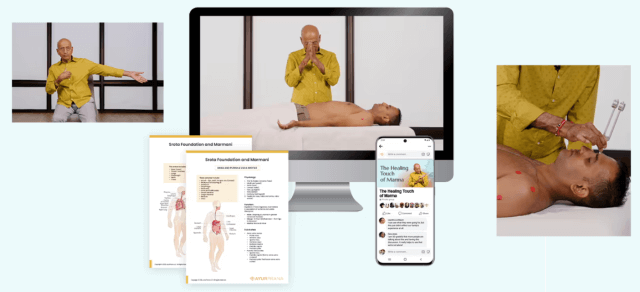 Each section features two sessions with detailed handouts, as well as mini video resources on the primary marmani for each srotas (channel) discussed.